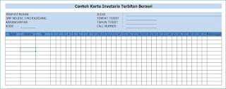 Contoh sederhana kartu inventaris buku dibawah ini mengambil dari buku inventaris yang kami pakai di perpustakaan sekolah kami. Cantumannya juga sederhana akan tetapi setidaknya cukup mencakup kebutuhan akan informasi yang disyaratkan sebagaimana diatas.